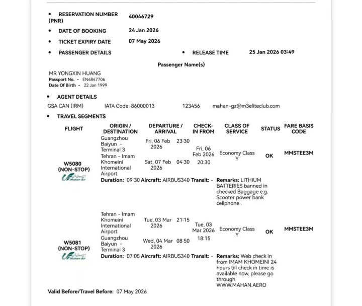 黄勇鑫此次中东之行早有规划,根据机票信息,他于2026年2月6日飞抵伊朗德黑兰的伊玛目·霍梅尼国际机场。按计划,他将在伊朗完成工作后前往伊拉克,之后再返回伊朗,搭乘3月3日的航班从德黑兰回广州。