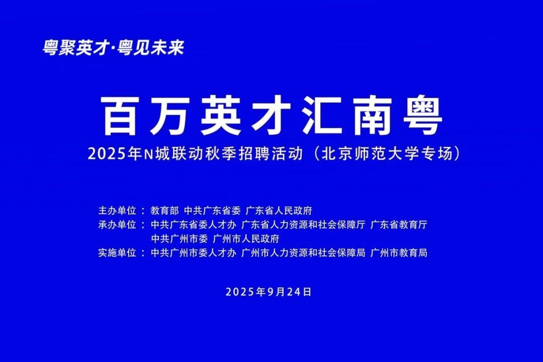 根据广东省高质量发展大会精神和“百万英才汇南粤”行动计划部署,“百万英才汇南粤”2025年N城联动秋季招聘会北京师范大学专场招聘会即将于2025年9月24日下午举办,并将邀请部分中国传媒大学和中央音乐学院毕业生现场参会。届时,现场有40+用人单位,供给超200+优质岗位,计划招聘超千人。助力广大优秀学子与广州发展机遇“双向奔赴”,共创未来!