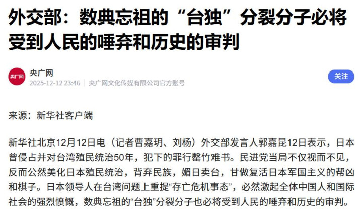 中方的态度其实一直很明确。12月31日,外交部发言人林剑直接表态,敦促日本执政者反思纠错,撤回错误言论,为中日正常交流创造条件。